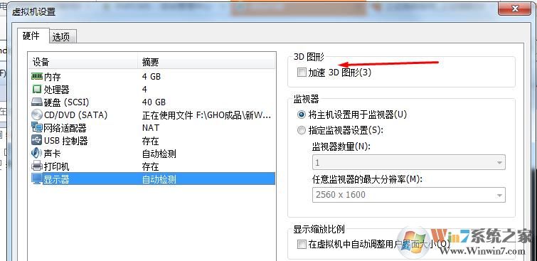 右鍵虛擬機設置—硬件—顯示器 取消加速3D圖形,如下圖:
