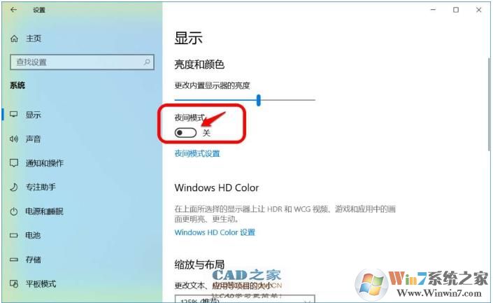 3、在顯示設(shè)置窗口中,我們看到:夜間模式的【開關(guān)】處于【關(guān)】的位置,如果是開的,你想關(guān)閉,那么點擊一下變成關(guān)閉就關(guān)掉夜間模式了;
