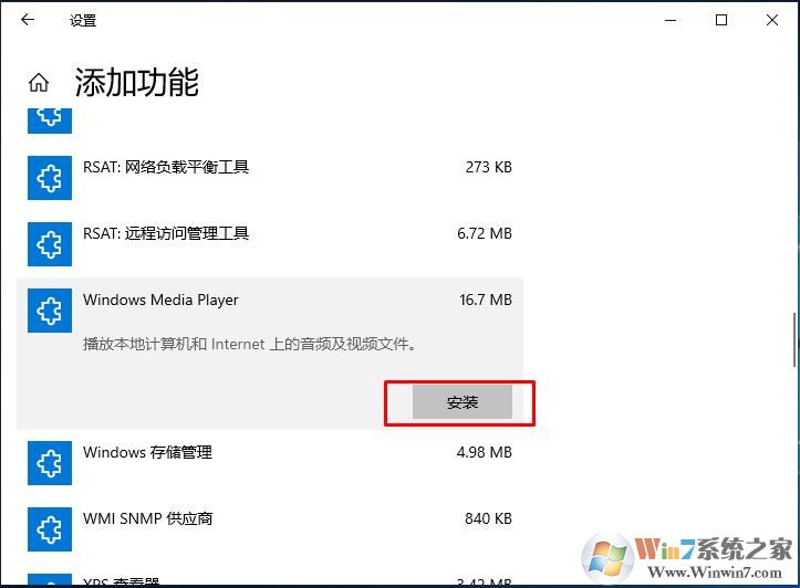4、當(dāng)然,卸載之后,也可以重新使用添加功能來(lái)添加Windows media player winwin7.com