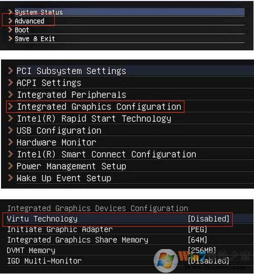 進(jìn)入BIOS頁面后,找到“SETTINGS”——“Advanced”——“Integrated Graphics Configuration”——“Virtu Technology”選項(xiàng),把“Disabled”修改為“Enabled”;