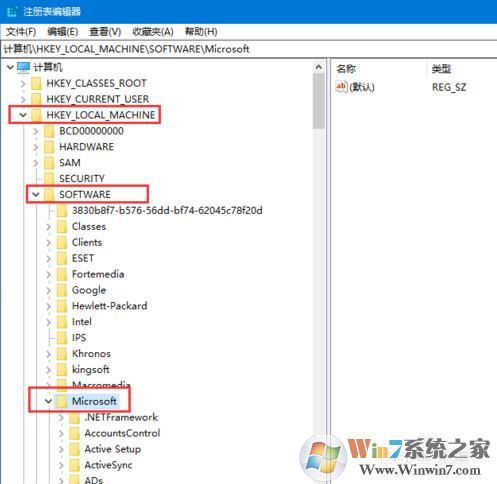 1、首先打開注冊表編輯器,然后定位到計算機\HKEY_LOCAL_MACHINE\SOFTWARE\Microsoft