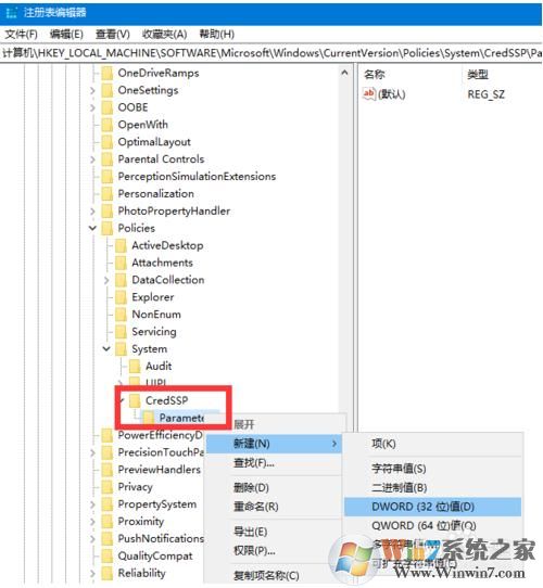 3、然后在system右擊,新建項目(新建文件夾)\CredSSP\Parameters