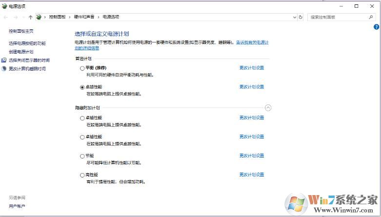 此時再打開電源計劃管理選項,展開隱藏的附加計劃后,選擇 卓越性能 模式就可以讓電腦性能最大化了,據(jù)測試性能將有10%的提升。