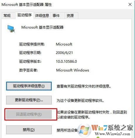 4、此時(shí)我們就打開(kāi)Windows10的顯卡驅(qū)動(dòng)屬性窗口,在這里點(diǎn)擊“驅(qū)動(dòng)程序”選項(xiàng)卡,在打開(kāi)的驅(qū)動(dòng)程序頁(yè)面中,點(diǎn)擊“回退驅(qū)動(dòng)程序”按鈕