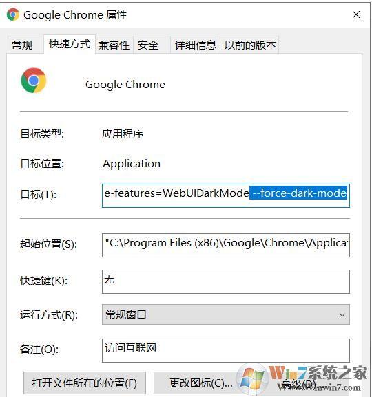 2、在目標(biāo)加入 --force-dark-mode 參數(shù),--前有空格,別忘了
