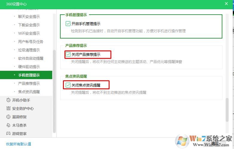 2、在產(chǎn)品管理提示這里,勾選 關(guān)閉產(chǎn)品推薦提示、關(guān)閉焦點(diǎn)資訊提示;