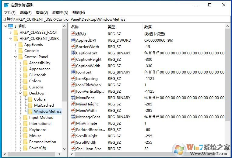 • 展開 HKEY_CURRENT_USER\Control Panel\Desktop\WindowMetrics;