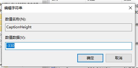 • 在右側(cè)找到CaptionHeight字符串值,它代表窗口標題欄的高度,其值計算方法為:-15*期望高度(像素)。比如,希望窗口標題欄高度為18,那么其值應(yīng)該為-15*18=-270;
