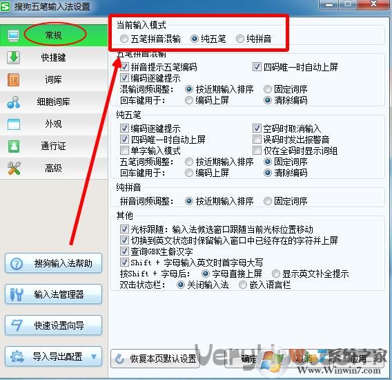 2、然后在常規(guī)下,我們可以看到有五筆拼音混輸、純五筆、純拼音幾種設(shè)置,那么選第一個就可以了。