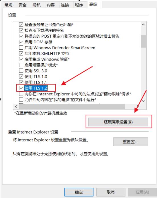 3、然后去高級那里打開 勾上"使用TLS 1.2"選項,或者還原高級設(shè)置。