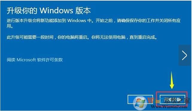 3、密鑰通過系統(tǒng)驗(yàn)證后,進(jìn)行下一步,會(huì)提示“升級(jí)你的windows版本”,我們點(diǎn)擊“開始升級(jí)”按鈕。如下圖所示。