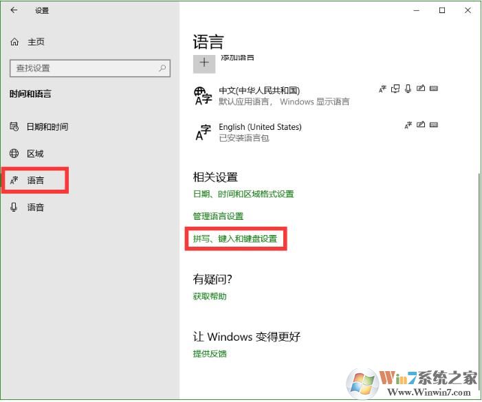 2. 在左側(cè)點(diǎn)擊“語言”標(biāo)簽頁,在右側(cè)找到“拼寫、鍵入和鍵盤設(shè)置”并點(diǎn)擊: