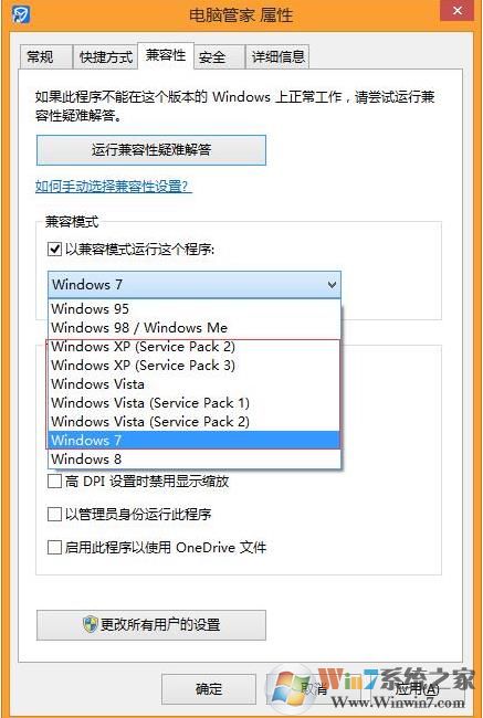 第三步:勾選以兼容模式運(yùn)行這個(gè)程序,選項(xiàng)下會(huì)有很多操作系統(tǒng),從最早的Windows95到Windows8操作系統(tǒng)。選擇一個(gè)合適的,不知道的話可以多試幾個(gè)。