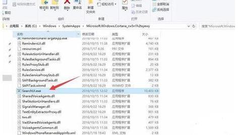3、打開文件夾,找到文件“SearchUI.exe”,這就是Cortana小娜的主程序