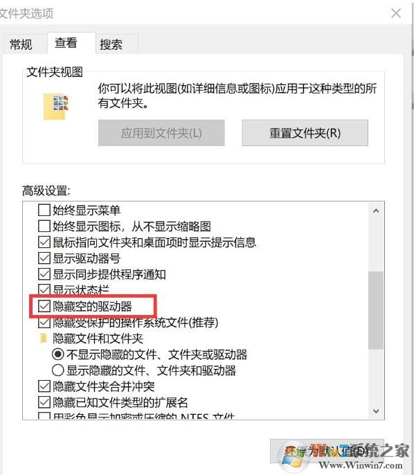 2、打開文件夾選項之后,點(diǎn)擊查看,在高級設(shè)置中找到隱藏空的驅(qū)動器,勾選后確定即可。