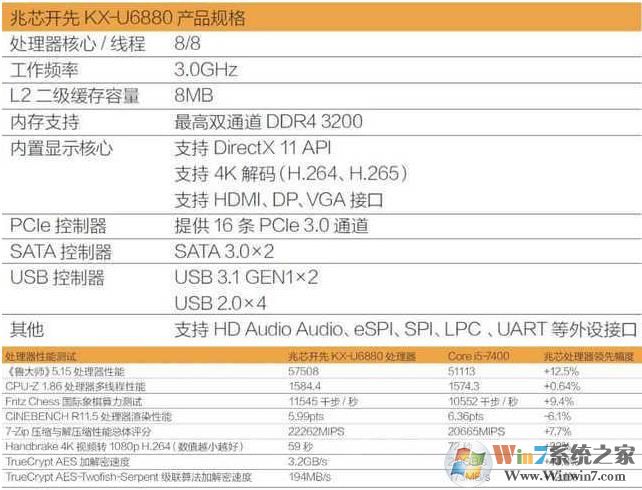上年國內媒體微型計算機就對KX-6000系列的KX-U6880做了簡單的評測,綜合多項測試,KX-U6880在多核性能上稍微領先了i5-7400,雖然KX-U6880是8核,i5-7400是4核,8打4,但這對于國產處理器來說也算是可喜的進步,不僅可以日常辦公使用,加上獨顯還能玩玩3A大作。