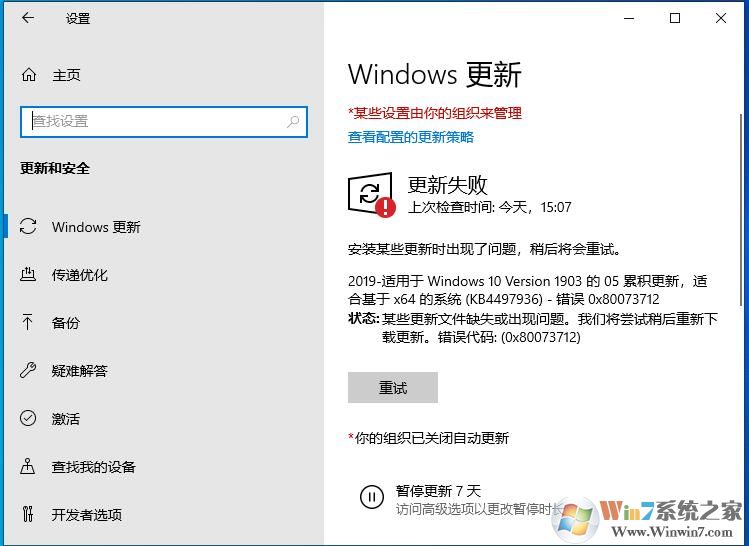最近有用戶反饋Win10 1903系統(tǒng)在更新補丁時遇到更新失敗,錯誤代碼0X80073712的問題,安裝某些更新時出現(xiàn)了問題稍后會將重試。