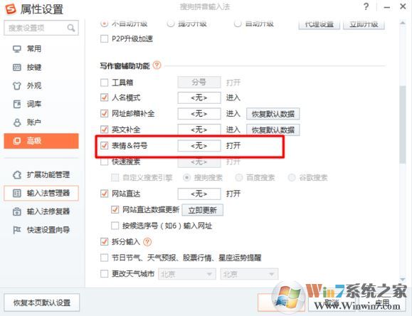 打開輸入法設(shè)置。在高級(jí)里面,將表情&符號(hào)勾選上,然后點(diǎn)擊確定,如圖所示: