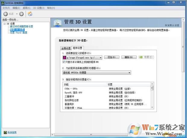 2、打開(kāi)之后選擇管理3D設(shè)置——程序設(shè)置——添加RAGE2的游戲啟動(dòng)程序——選擇高性能NVIDIA處理器