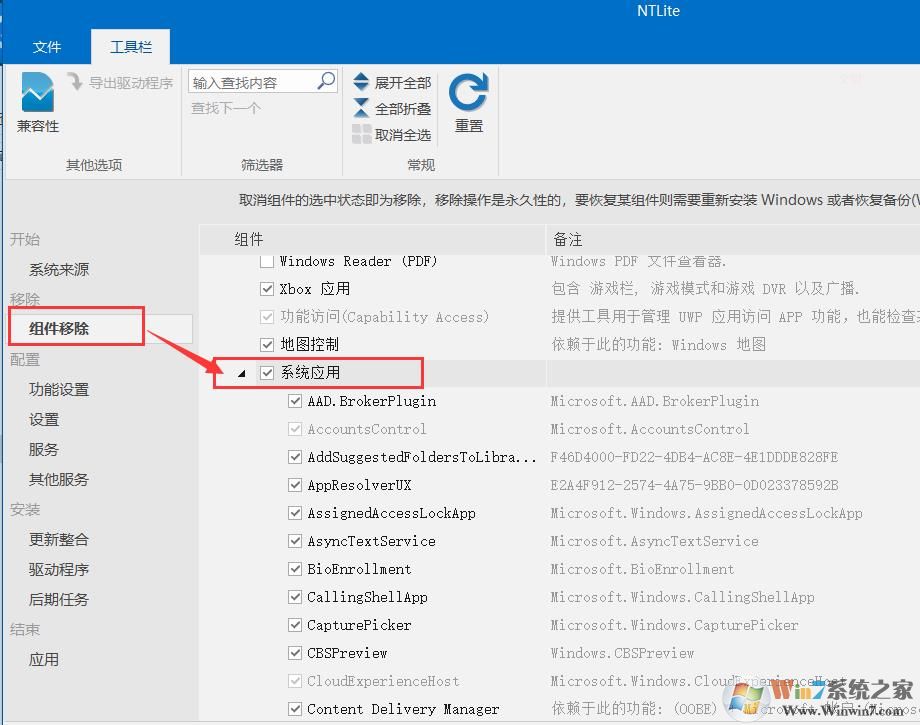 1、在組件移除里,找到系統(tǒng)應(yīng)用,如下圖