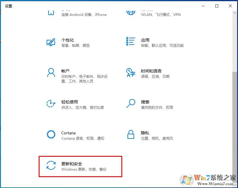 2、在Windows設置中,找到最下方的 更新和安全 選項,如下圖,紅色的框框
