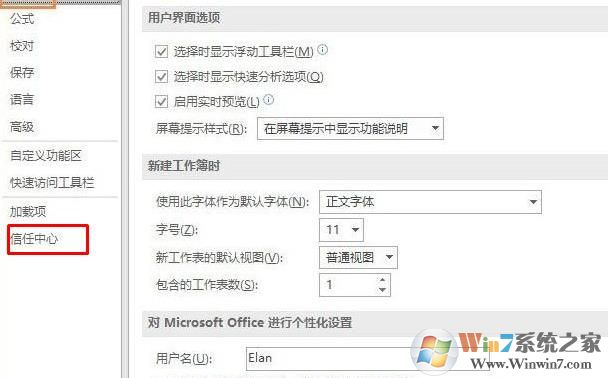 2、然后在選項中,信任中心;Win7系統(tǒng)之家 cncxm.com