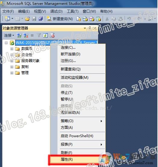 2. 在管理中,右鍵數(shù)據(jù)庫服務(wù)器名,選擇【屬性】。