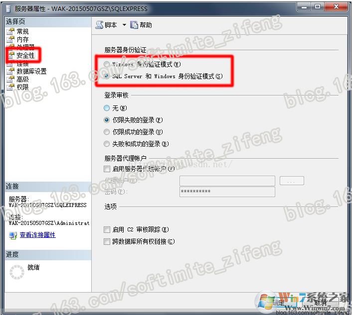 3. 打開“服務(wù)器屬性”窗口,選擇【安全性】,更改“服務(wù)器身份驗(yàn)證”,如下圖所示。