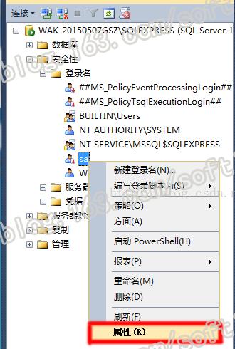 4. 展開數(shù)據(jù)庫服務(wù)器名—“安全性”—“登錄名”, 右鍵“sa”用戶,選擇【屬性】。