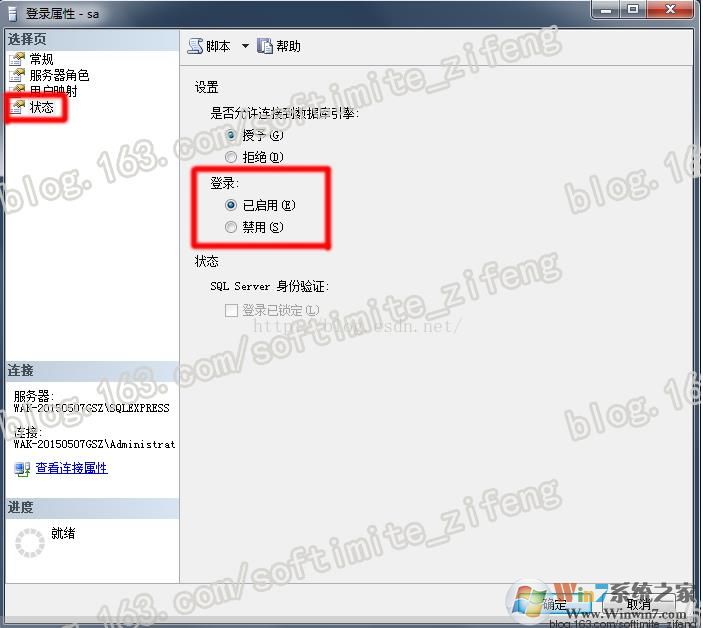 6. 仍然在“登錄屬性”窗口,選擇【狀態(tài)】,選擇“登錄”下面的【已啟用】,如下圖所示。
