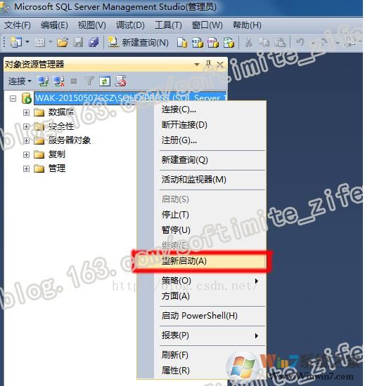 7. 右鍵數(shù)據(jù)庫服務(wù)器名,選擇【重新啟動(dòng)】,重啟SQL Server 2014