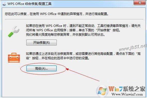 4、進去之后可以看到彈出一個新的對話框【wps office 綜合修復(fù)/配置工具】,選擇【高級】;