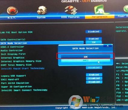 起動(dòng)電腦上時(shí)不斷按Del進(jìn)到BIOS頁(yè)面,轉(zhuǎn)換到Peripherals頁(yè)面,挑選SATA Mode Selection回車鍵,挑選IDE回車鍵,按F10儲(chǔ)存重新啟動(dòng)。