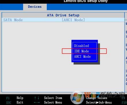 2、挑選SATA Mode按回車鍵,在彈出來的小對(duì)話框挑選IDE Mode回車鍵,最終按F10儲(chǔ)存重新啟動(dòng)。
