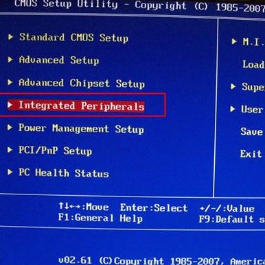 1、起動(dòng)電腦上時(shí)不斷按Delete或F2或F1等功能鍵進(jìn)到BIOS,按↓方向鍵挑選Integrated Peripherals,按回車鍵;