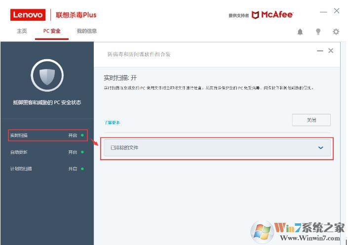 1、打開聯(lián)想殺毒Plus,選擇實時掃描,選擇已排除的文件,如圖: