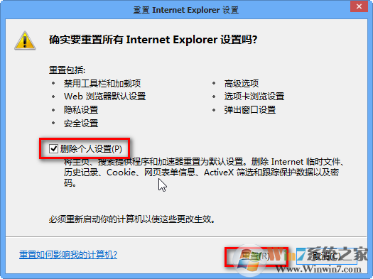 3、勾選下面的“刪除個人設(shè)置”,點擊“重置”;