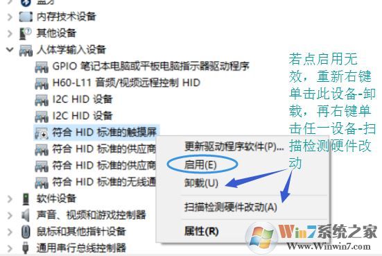 第三步:若后期想繼續(xù)使用,可右鍵單擊這個(gè)設(shè)備—啟用;若萬一無法啟用或者觸摸屏功能失靈可嘗試卸載此設(shè)備-右鍵單擊任一設(shè)備掃描檢測硬件改動。