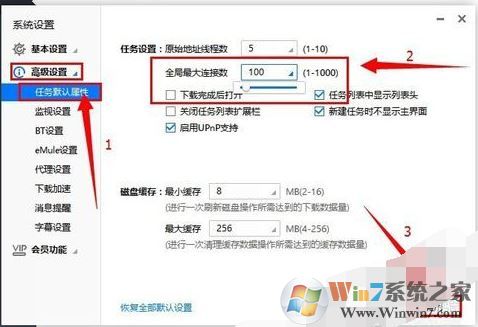 3.、接著在打開的窗口中切換到高級設(shè)置,然后選擇任務(wù)默認屬性,在里面我們將最大連接數(shù)修改到100,然后點擊確定保存設(shè)置。