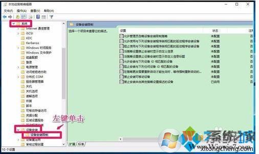 3、我們在系統(tǒng)的展開項中找到設(shè)備安裝 - 設(shè)備安裝限制,并左鍵單擊:設(shè)備安裝限制。