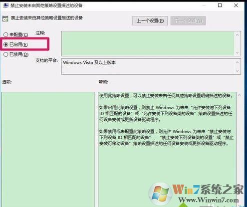 5、在打開的禁止安裝未由其他策略設(shè)置描述的設(shè)備窗口,可以看到禁止安裝未由其他策略設(shè)置描述的設(shè)備其選項為“已啟用”。