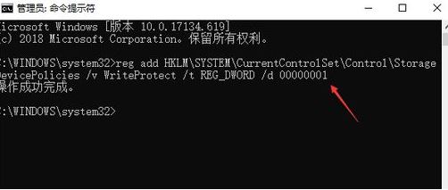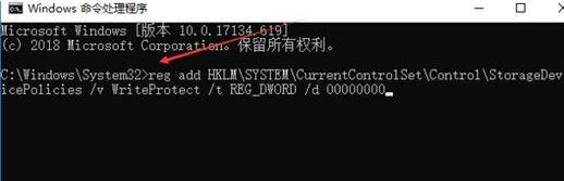 二、輸入以下命令添加注冊(cè)表信息:reg add HKLM\SYSTEM\CurrentControlSet\Control\StorageDevicePolicies /v WriteProtect /t REG_DWORD /d 00000000,然后回車即可。