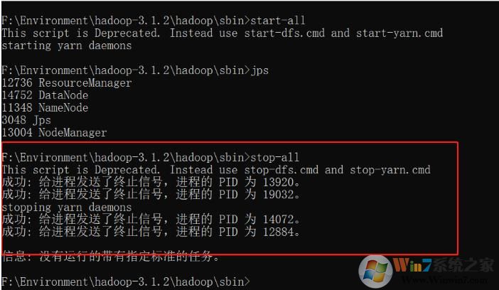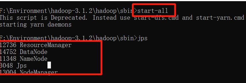 進(jìn)入hadoop的sbin目錄 我這里在 : F:\Environment\hadoop-3.1.2\hadoop\sbin # 啟動 # 會自動開啟四個(gè)新的命令行窗口,窗口沒打印異常即啟動成功 start-all # 停止 stop-all # 查看正在運(yùn)行的實(shí)例進(jìn)程及端口 jps