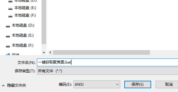 2、點(diǎn)擊【文件】--【另存為】,在另存為界面將【保存類型】修改為“所有文件”,將文件名修改為【一鍵獲取聚焦圖.bat】;