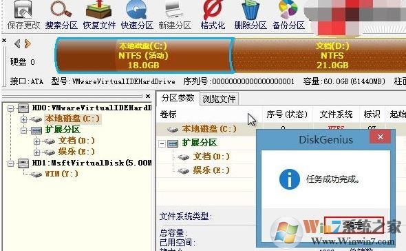 5、然后耐心等候工具進(jìn)行重建主引導(dǎo)(它負(fù)責(zé)磁盤(pán)操作系統(tǒng)(DOS)對(duì)磁盤(pán)進(jìn)行讀寫(xiě)時(shí)分區(qū)合法性的判別、分區(qū)引導(dǎo)信息的定位,它由磁盤(pán)操作系統(tǒng)(DOS)在對(duì)硬盤(pán)進(jìn)行初始化時(shí)產(chǎn)生的。)記錄的修復(fù)工作,修復(fù)完成后會(huì)彈出“任務(wù)成功完成”的提示窗,直接按下“確定”按鍵,如下圖所示: