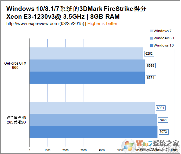 先來看看3DMark的基準測試,運行的是FireStrike的標準模式,Windows 7系統(tǒng)下的得分是最差的,而且差異較為明顯,Windows 8.1的表現(xiàn)略低于Windows 10,不過三種的實際差異其實不大。
