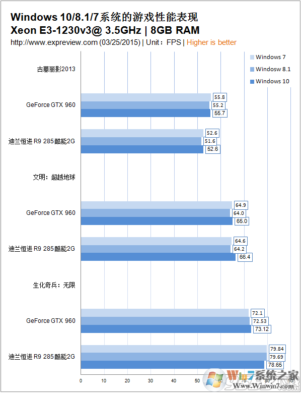 我們來看看Windows 10、Windows 8.1與Windows 7系統(tǒng)會對游戲性能有怎么樣的影響,驅(qū)動版本都更新到各自最新的,測試平臺使用Xeon E3-1230 v3處理器,雙通道8GB內(nèi)存,顯卡則會分別拿GeForce GTX 960和Radeom R9 285來測試,看看N卡與A卡在三個不同系統(tǒng)下會有怎么樣的差別。使用的是中等的配置,看看3款系統(tǒng)在相同的配置下對與游戲的運行存在哪些差異
