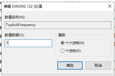 5. 分別命名為“TcpAckFrequency”和“TCPNoDelay”,雙擊打開這兩個值,都把數(shù)值數(shù)據(jù)修改為1,確定保存;