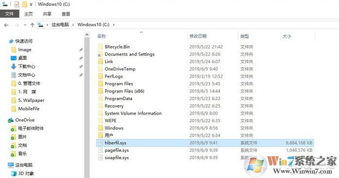 3. 關(guān)閉之后,我們需要重新啟動計算機,然后hiberfil.sys休眠文件就會被刪除了,看下圖,節(jié)省了很多空間哦。Win10系統(tǒng)下載 cncxm.com/win10/
