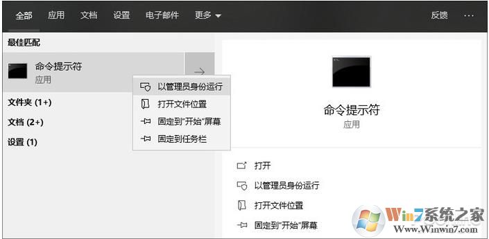 1. Cortana搜索框輸入“cmd”,右擊“命令提示符”以管理員身份運行;
